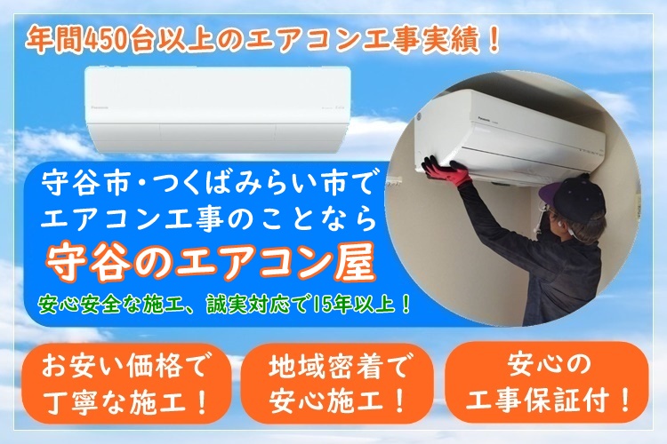 守谷のエアコン屋は家庭用のエアコン工事を主にエアコン取り付け・取り外し工事をおこなっている地域密着のエアコン業者で、守谷市・つくばみらい市を中心に茨城県で活動しております。